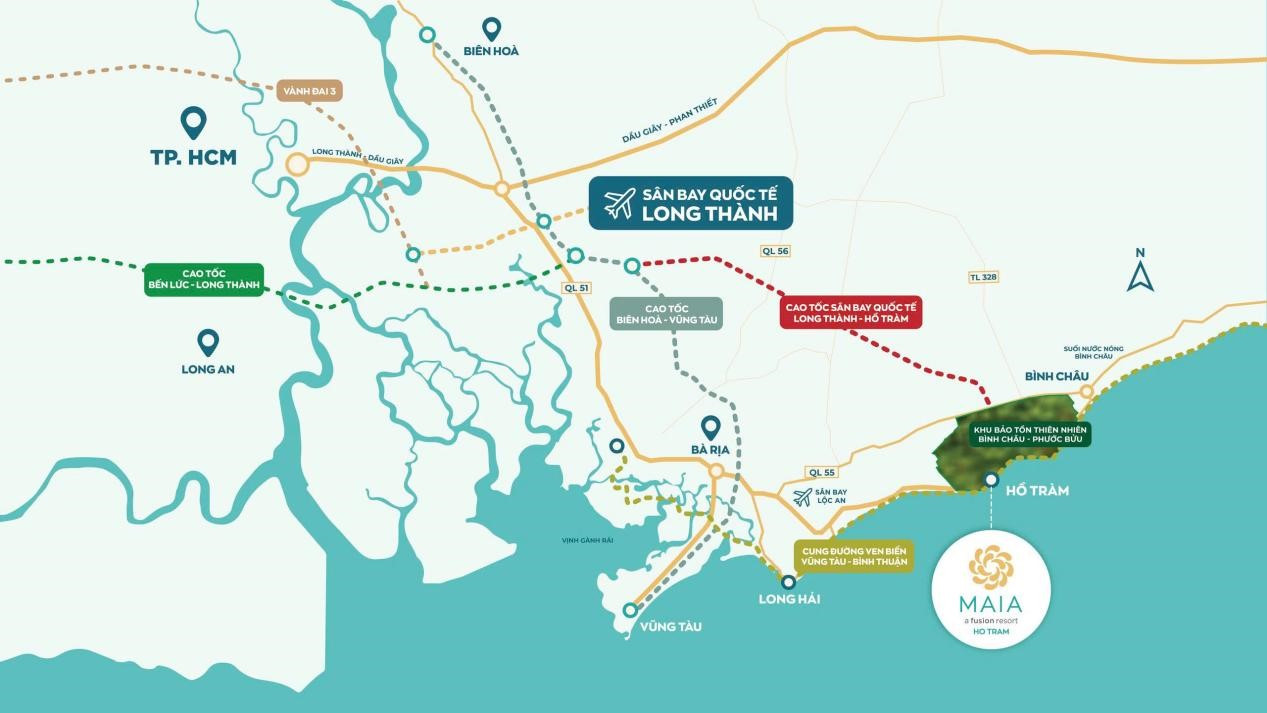 Nằm cách trung tâm TP.HCM 120km và 41km từ sân bay quốc tế Long Thành - dự kiến đón 25 triệu lượt khách quốc tế/năm ở giai đoạn 1 - Hồ Tràm là vùng biển gần trung tâm đô thị lớn và sân bay quốc tế lớn bậc nhất cả nước. Điều này giúp nơi đây vừa thu hút khách nội địa, vừa thuận lợi đón dòng khách ngoại cao cấp đến từ các trung tâm kinh tế lớn trong khu vực như Singapore, Hàn Quốc, Nhật Bản & các nước Âu Mỹ.