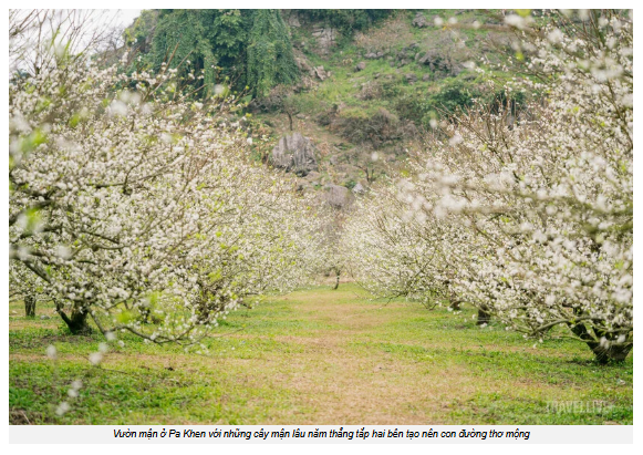 Ngày 5/12, thổ địa Mộc Châu Quang Kiên đã ghé Pa Khen và ghi lại những khung hình đầu đông khi hoa vừa đạt độ đẹp. Anh nói Mộc Châu đang vào những ngày nắng đẹp, trời se lạnh dìu dịu, rất hợp để đi vào vườn. Trong các điểm hoa đang nở như Phường Thảo Nguyên, Nà Ka hay Mu Náu, anh đánh giá vườn mận ở tổ dân phố Pa Khen là nơi có sắc hoa dày và đều nhất thời điểm này. Những cây mận ở đây đều được trồng lâu năm, gốc lớn và thẳng hàng, tạo nên cảm giác vững chãi, đồng thời khiến những dải trắng trải dài đều hơn trên cả khu vườn.