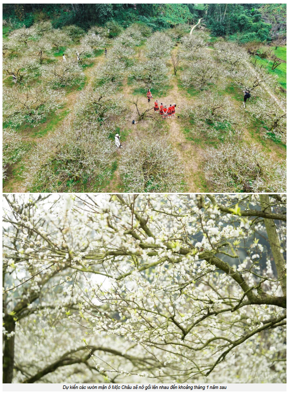 Hoa trái vụ sẽ tiếp tục nở gối nhau ở các vườn trong suốt tháng mười hai. Còn chính vụ hoa mận dự kiến sẽ rộ vào cuối tháng 1 năm sau, khi hoa mai anh đào và hoa cải cũng vào độ nở. Thời điểm đó, Mộc Châu thường trắng rực cả những quả đồi, trở thành một trong những mùa đẹp nhất năm trên cao nguyên. Nhưng ngay lúc này, giữa đầu đông, vẻ đẹp của mùa hoa sớm lại có một nét thong thả riêng, nhẹ nhưng khó rời mắt.