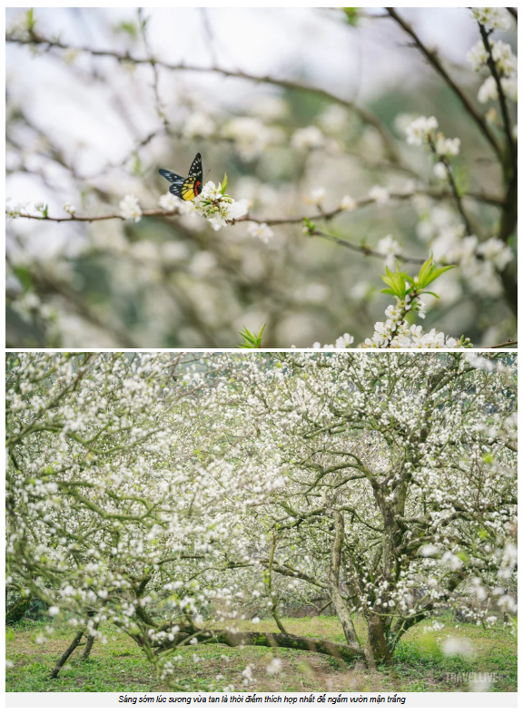 Thời khắc thung lũng sáng bừng giữa sắc trắng đầu mùaVới những người muốn ngắm hoa mận trái vụ tại Nà Ka, thời điểm phù hợp nhất trong ngày là từ 8 đến 10 giờ sáng. Nếu đến quá sớm, sương mù dày ở thung lũng dễ che mất cả triền hoa. Trưa và chiều nắng gắt, còn cuối ngày ánh sáng tắt nhanh nên khó bắt được khoảnh khắc đẹp. Một buổi sáng đủ nắng, đủ lạnh và đủ độ trong chính là lúc hoa mận đẹp nhất: những cánh hoa trắng lấp lánh trong ánh nắng mỏng và hơi lạnh vờn quanh, tạo nên không gian vừa thanh vừa tĩnh.