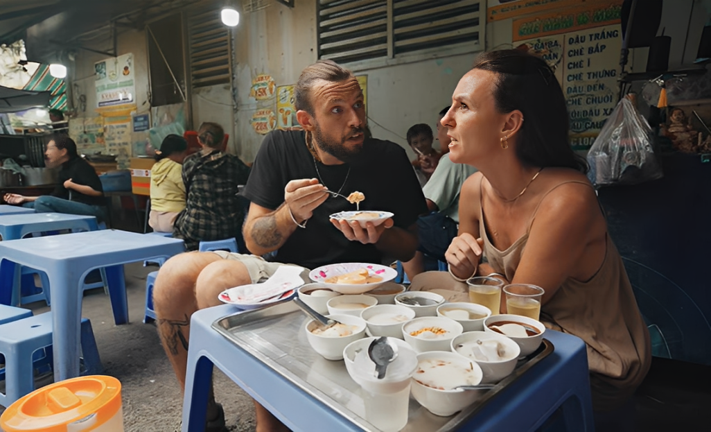 Tại TPHCM, cặp vợ chồng trẻ có dịp trải nghiệm nhiều món ngon như bánh cuốn, phở bò, nộm bò khô… Trong đó, chè mâm là thức quà đường phố để lại cho họ ấn tượng đậm nét.