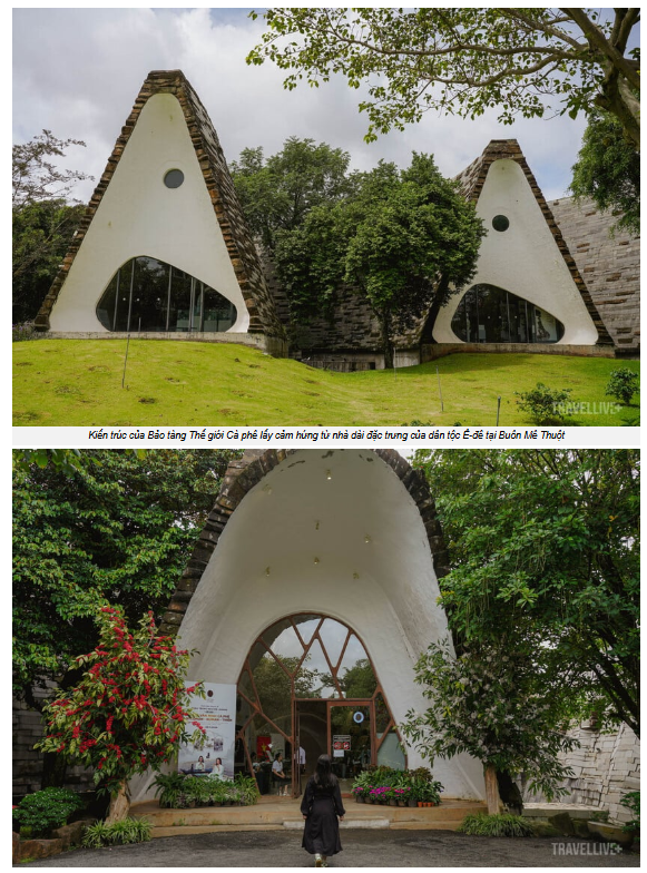 Ấn tượng đầu tiên ập đến không phải mùi cà phê rang, cũng không phải những hiện vật lấp lánh sau lớp kính, mà là chính tòa nhà. Kiến trúc bảo tàng lấy cảm hứng từ nhà dài Ê-đê, mái cong uốn lượn, thân vỏ ốp bằng những tảng đá bazan trầm mặc. Đứng từ xa, tôi thấy nó như một khối đàn đá khổng lồ cắm giữa nền đất đỏ Buôn Mê Thuột, vừa vững chãi vừa mềm mại.