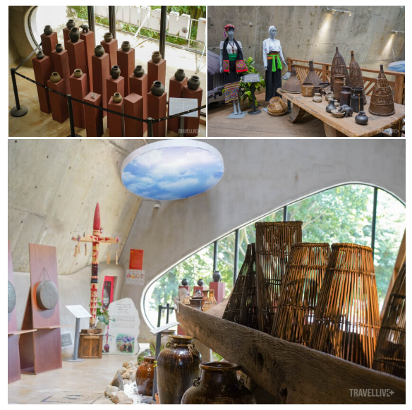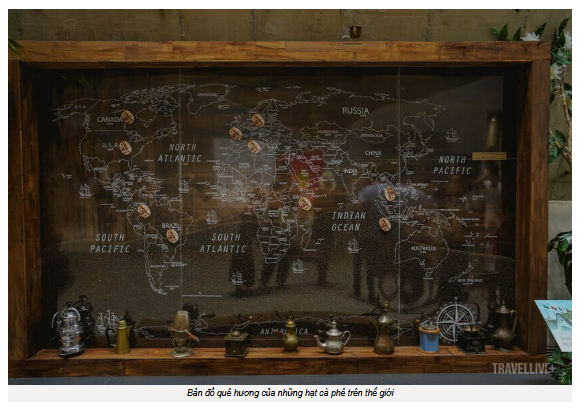 Ở tiền sảnh, tôi được giới thiệu về những nền văn minh cà phê nổi tiếng trên thế giới, những vùng đất của hạt cà phê xuyên qua các châu lục trên tấm bản đồ kính. Rồi chỉ một cái xoay mình, những vết tích của văn hoá Tây Nguyên như trống H’gơr (trống cái da trâu) của người Ê-đê, cồng chiêng, các sản phẩm từ đất nung, nông cụ, nhạc cụ… mở ra trước mắt một nền văn hoá bản sắc của Việt Nam, vừa thân quen mà vừa mới mẻ.