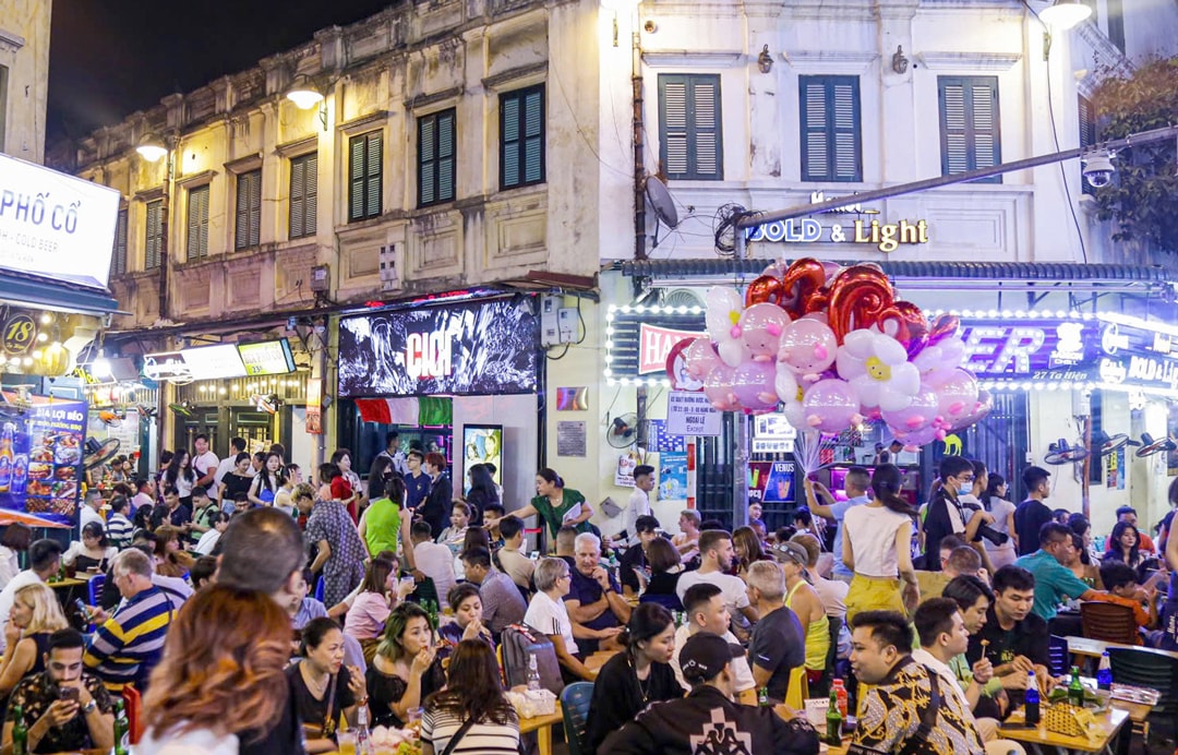 Ngã tư Lương Ngọc Quyến - Tạ Hiện (quận Hoàn Kiếm) luôn thu hút nhiều du khách trong nước và quốc tế tới thưởng thức ẩm thực. Ảnh: Hiệp Dương