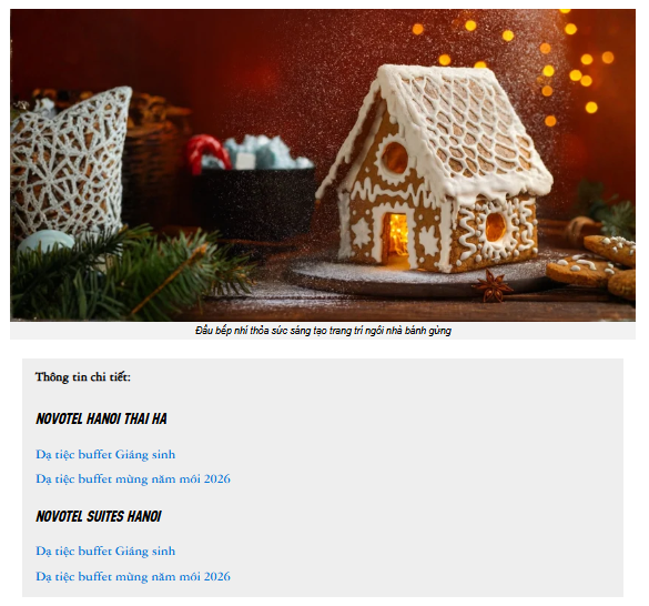 Hòa mình vào không khí ấm áp và rộn ràng của mùa lễ hội, dạ tiệc buffet Giáng sinh tại Novotel Hanoi Thai Ha mang đến trải nghiệm khó quên cho cả gia đình. Ngày 24/12/2025, từ 18:00 đến 22:00 tại Nhà hàng Food Exchange, thực khách sẽ được thưởng thức tiệc buffet phong phú, cùng những hoạt động vui nhộn và âm nhạc lễ hội. Trẻ em sẽ được tham gia lớp học làm bánh nhà gừng cùng đầu bếp và gửi thư đến Ông già Noel, nhận quà chào mừng và những phần quà bất ngờ từ ông già Noel, đồng thời cùng nhau cắt bánh Khúc gỗ Giáng Sinh.