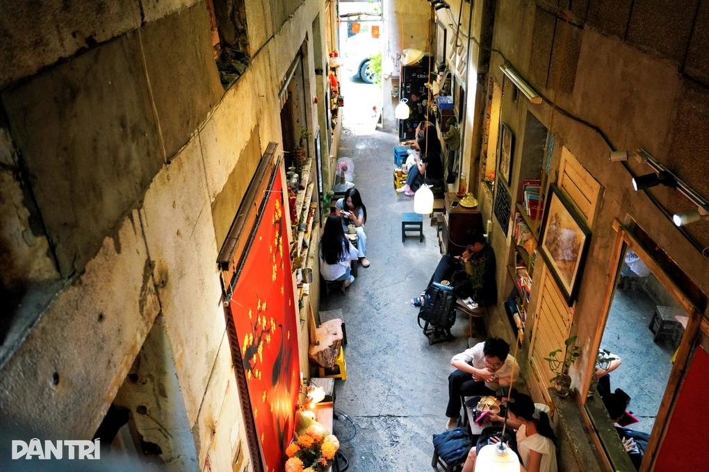 Uyên kể, điều khiến cô bất ngờ là quán không phải trong nhà mà chính là một con hẻm nhỏ. Giữa lối đi hẹp ấy, người ta bày những bộ ghế nhựa nhỏ, kê thêm những chiếc tủ loang màu thời gian, đặt heo đất, đồ chơi trẻ con, ảnh cũ… tạo nên một không gian ấm áp.