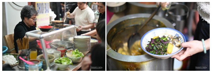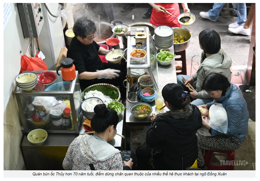 Một trong những “linh hồn” của ngõ ẩm thực chợ Đồng Xuân là quán bún ốc Thủy hơn 70 năm tuổi, nơi được nhiều thế hệ người Hà Nội coi là địa chỉ quen thuộc. Mỗi bát bún có giá dao động từ 40.000 - 50.000 đồng/bát tùy loại ốc, thêm chuối hoặc đậu. Quán mở cửa từ 7h30-17h30, đông khách nhất trong khung giờ 11h-13h.