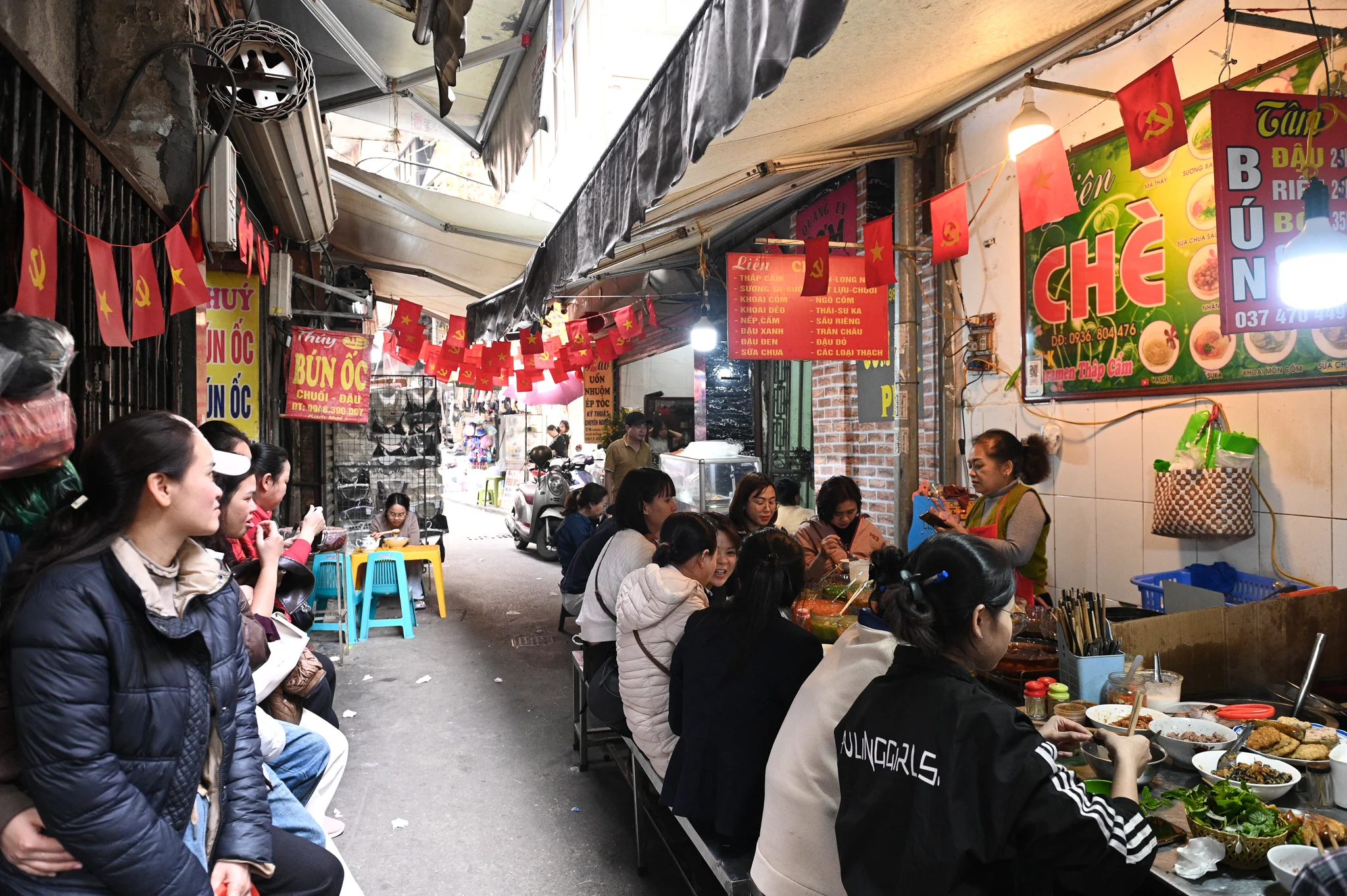 Những bức tường phủ màu thời gian, mái hiên thấp, dây điện chằng chịt, tiếng rao hàng xen lẫn tiếng cười nói của thực khách. Ngõ không rộng, nhưng luôn đông đúc, tấp nập. Người bán bận rộn chan nước dùng, gắp bún, thái thịt, người ăn kiên nhẫn chờ đến lượt, ngồi san sát trên những chiếc ghế nhựa thấp, thưởng thức món ăn trong sự náo nhiệt rất riêng của Hà Nội.