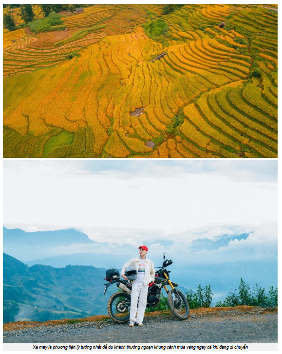 Với phương tiện di chuyển, xe máy vẫn là lựa chọn được nhiều người yêu thích bởi sự chủ động và cơ hội dừng lại bất cứ đâu để ngắm cảnh hoặc chụp ảnh. Trong hành trình, du khách có thể chọn những homestay views ruộng lúa hoặc ghé các quán cà phê view lúa chín để vừa thưởng thức hương vị ấm nóng vừa phóng tầm mắt ra những thửa ruộng vàng rực.