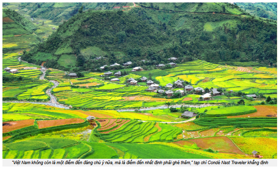 Condé Nast Traveler cũng nhắc đến những giải thưởng danh giá mà du lịch Việt Nam giành được tại World Travel Awards vừa qua. Trong đó, Việt Nam lần thứ 6 được bình chọn là “Điểm đến hàng đầu châu Á,” cùng các danh hiệu như “Điểm đến di sản hàng đầu châu Á” và “Điểm đến thiên nhiên hàng đầu châu Á.” Những danh hiệu này một lần nữa khẳng định vị thế, thương hiệu, hình ảnh du lịch Việt Nam là điểm đến đa sắc màu, đa trải nghiệm, hấp dẫn du khách trong và ngoài nước.